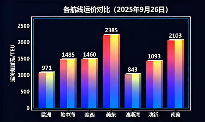 9月26日上海港出口至欧洲基本港运价跌至$971/TEU,较上期跌7.7%,跌破1000 美元;