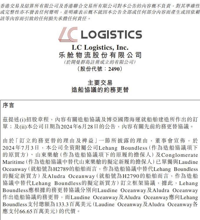 乐舱物流在公告中表示,Lehang Boundless(造船协议项下的原买方)、山东乐舱(作造船协议项下的原履约担保人)及Conglomerate Maritime(造船协议中替代山东乐舱的拟定新履约担保人)已单独与Laudine Oceanway(就船号为H2789的船舶而言,作为造船协议中替代Lehang Boundless的拟定新买方)及Aludra Oceanway(就船号为H2790的船舶而言,作为造船协议中替代Lehang Boundless的拟定新买方)订立框架协议。