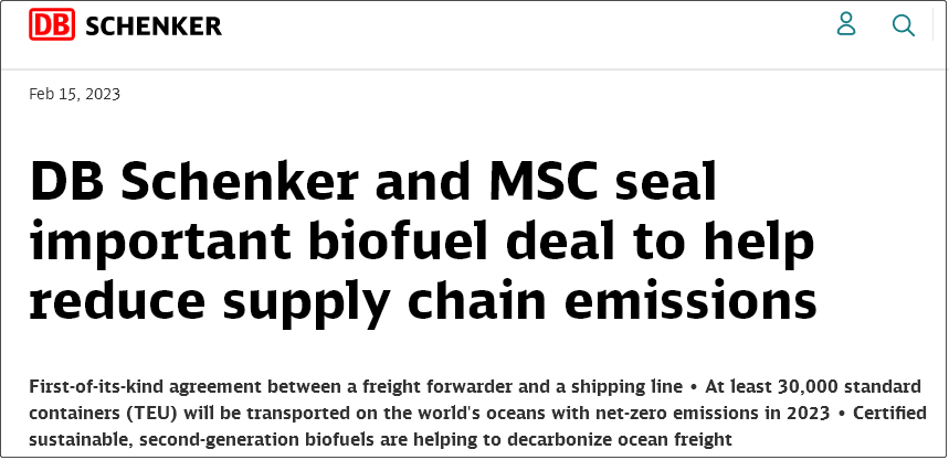 据悉,2月15日,地中海航运(MSC)和货运代理德铁信可(DB Schenker)宣布达成了一项创新协议——生物燃料采购协议,以帮助减少供应链中的二氧化碳排放。