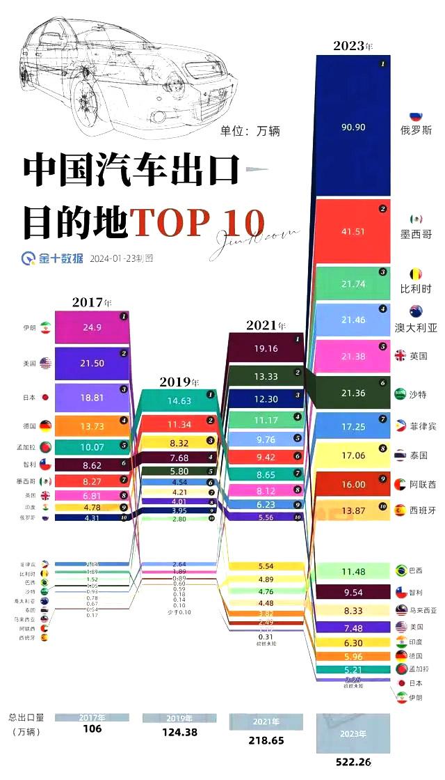 另外包括菲律宾、泰国、阿联酋、西班牙、巴西等一些国家的出口总量都达到10万辆以上。对德国,美国这些汽车强国的出口量也达到5万辆以上。