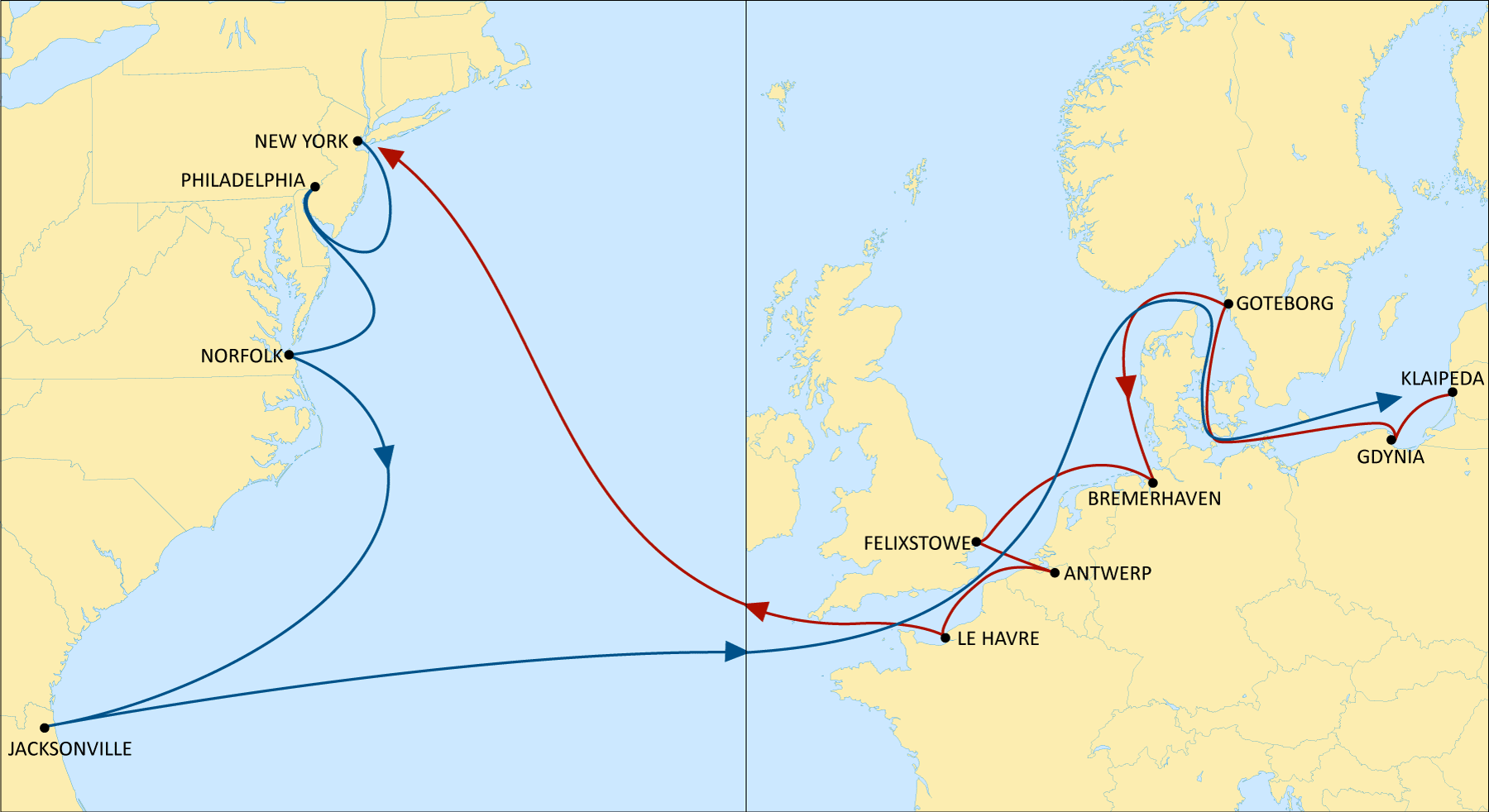 Klaipeda – Gdynia – Goteborg – Bremerhaven – Felixstowe – Antwerp – Le Havre – New York – Philadelphia – Norfolk – Jacksonville – Klaipeda.